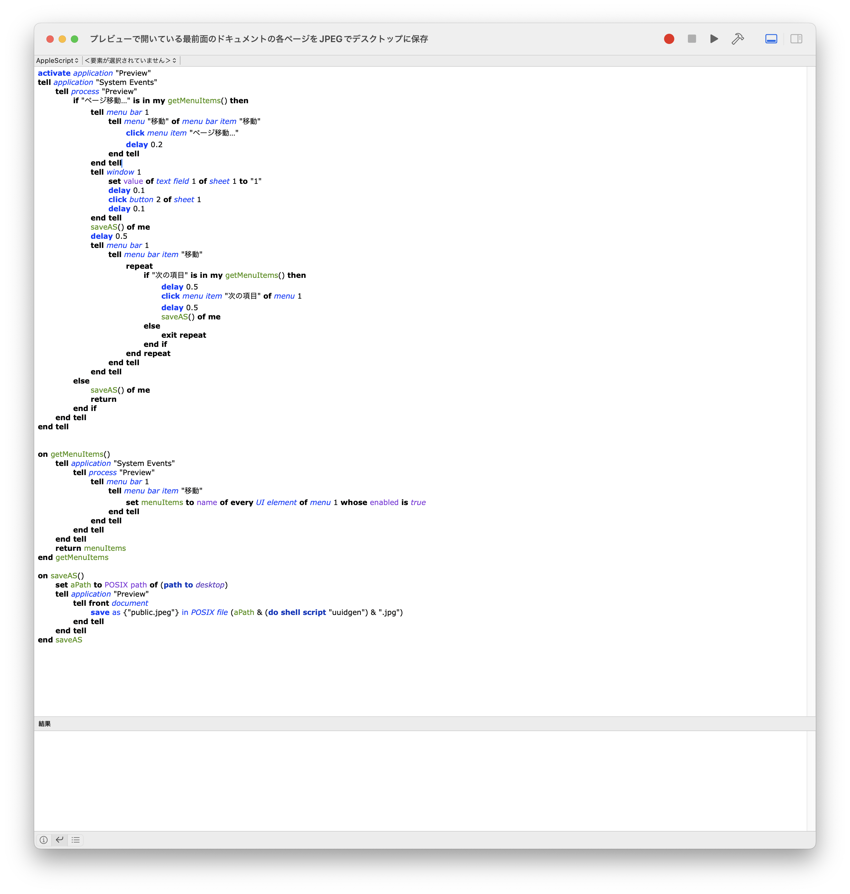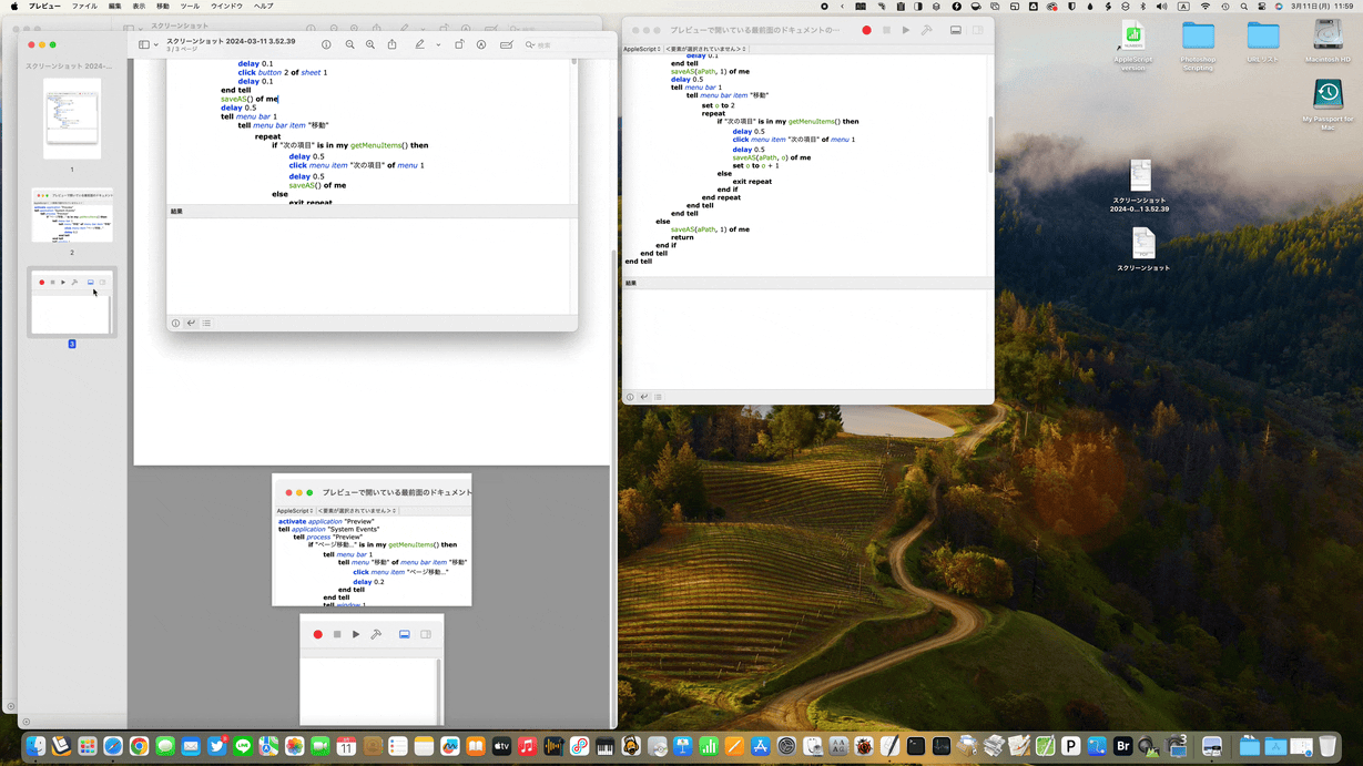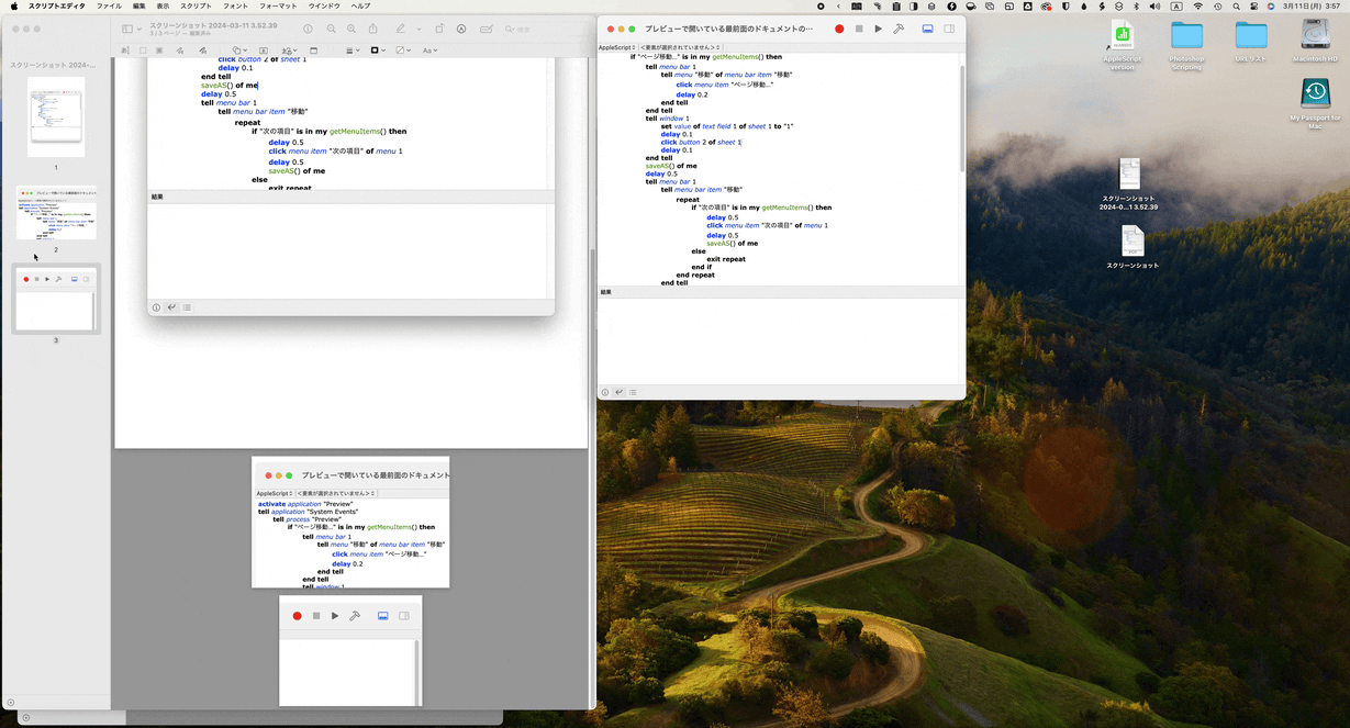 マシンに合わせて、小休止(delay)の時間の調整が必要かもしれませんが、プレビューでPDFを開いてスクリプトを実行すると