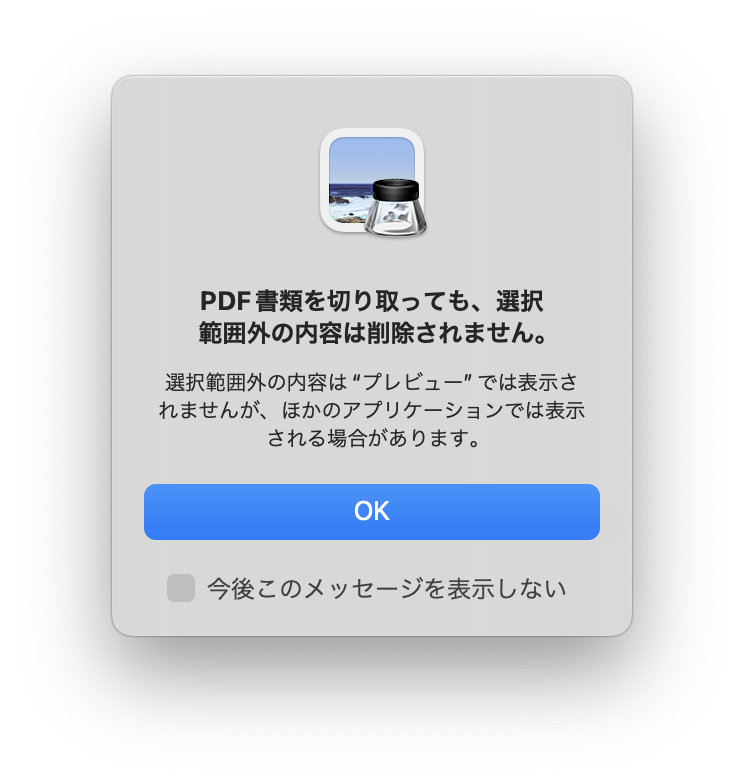 プレビューでのトリミングはトリミングする時画像のように警告が出ると思いますが、
