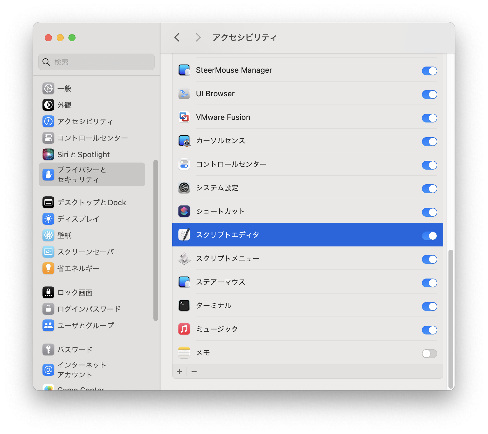 おそらく、システム設定のプライバシーとセキュリティのアクセシビリティでスクリプトエディタを許可すると動作すると思います。