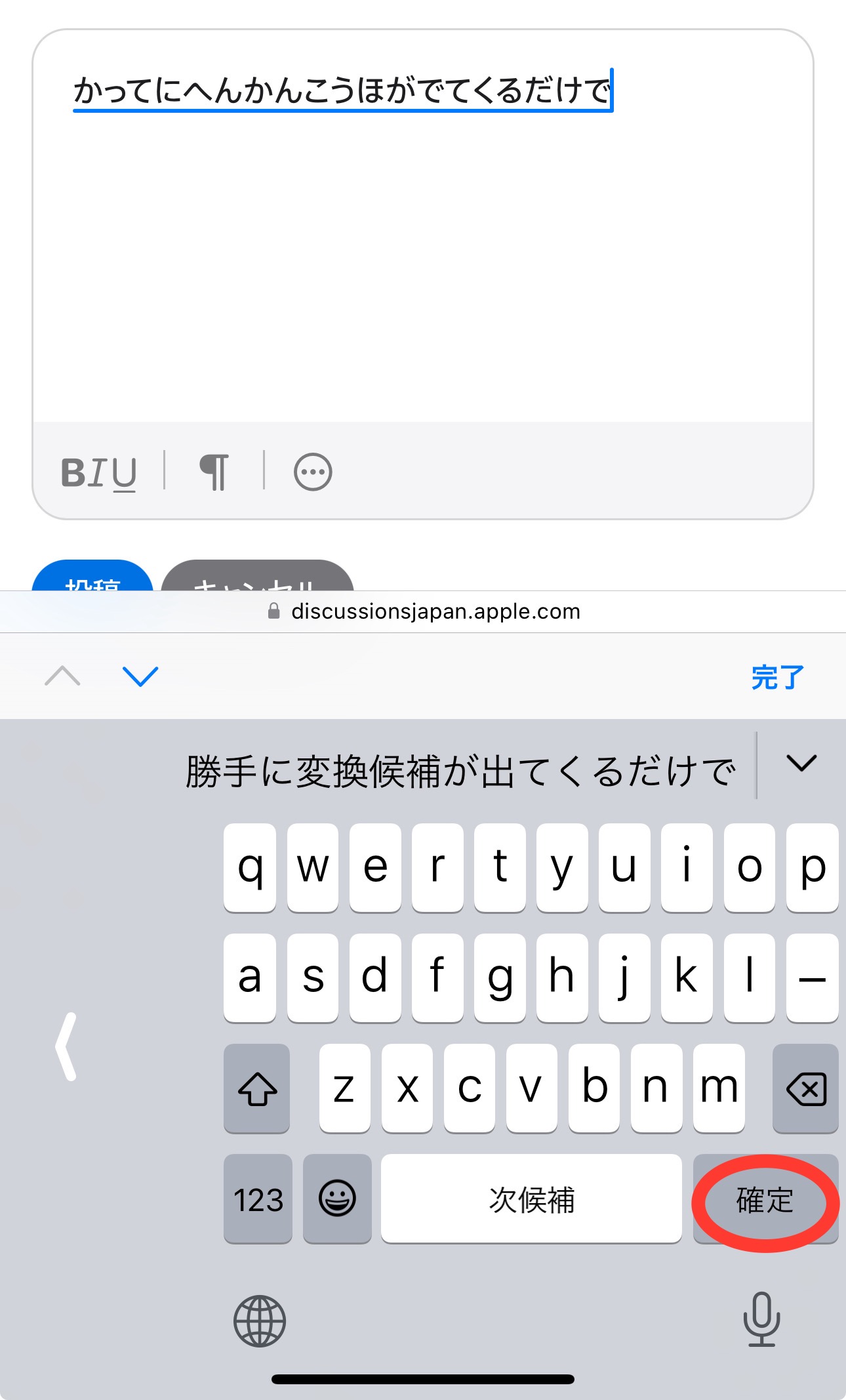 勝手に変換候補が出てくるだけで、入力して変換候補を選ばずに確定キー(赤丸)をタップすれば良いだけです。