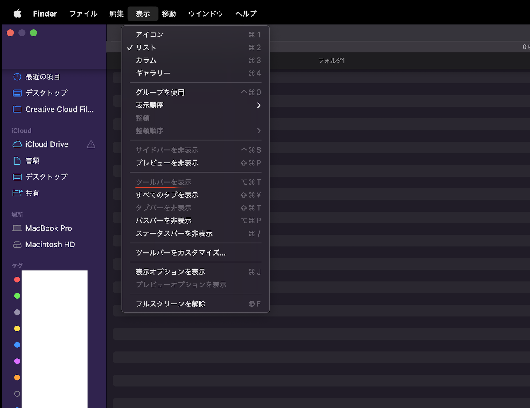 消えた時にFinderの表示メニューでツールバーの表示設定メニューはどうなっていますか?
