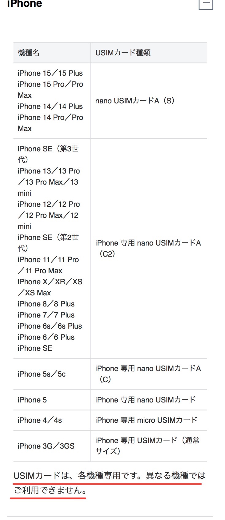 Q. 機種ごとのUSIMカードの種類について教えてください。