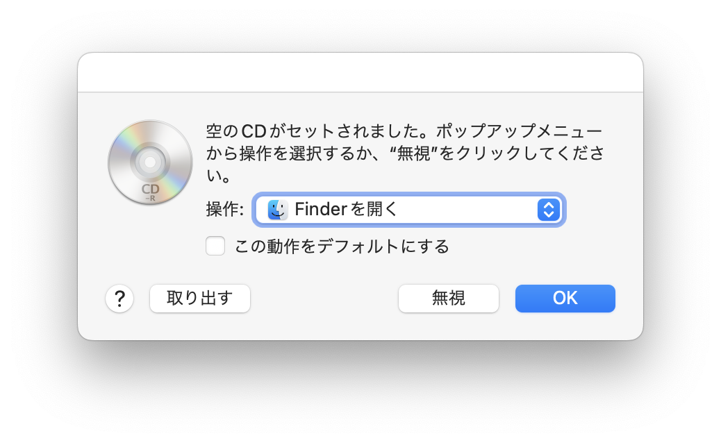 CD-ROMの場合は、Finderの環境設定→一般で「CD、DVD、およbiPod」にチェックを入れておく。