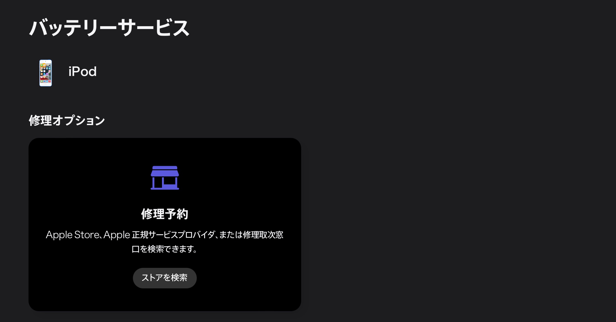 iPod touchのバッテリー交換のページを見ていたのですが、「配送(オンライン)修理」が表示されません。