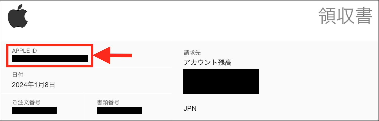 Apple から届く「領収書」メールに記載されている「Apple ID(下の画像赤枠部分)」が現在サインインされている Apple ID と同じかどうか確認 して見て下さい。