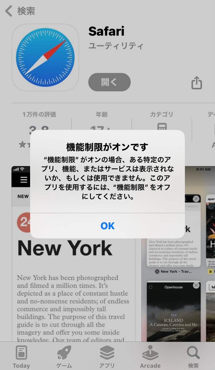 Safariも消してしまっていたので、アプリストアからマイソフトバンクやSafariを開こうと思っても『制限機能…』と出てきて開けません。