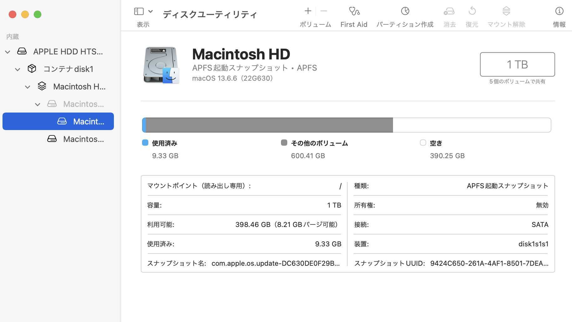 このようにMacintosh HDのシステムボリューム自体が複数のボリュームに分かれてます。他にも、起動時に利用されるだけのボリュームとか構成はとても複雑です。なので、これらの複数のシステムボリュームの構成ボリュームを一つ一つバラバラにユーザがみたところでわかりません。稼働時に一つのシステムボリュームとして見えるようになってます。