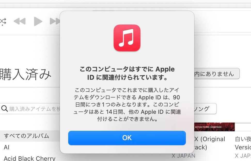 このコンピュータでこれまでに購入したアイテムをダウンロードできる Apple ID は、90日間につき1つのみとなります。このコンピュータはあと 14日間、他の Apple ID に関連付けることができません。