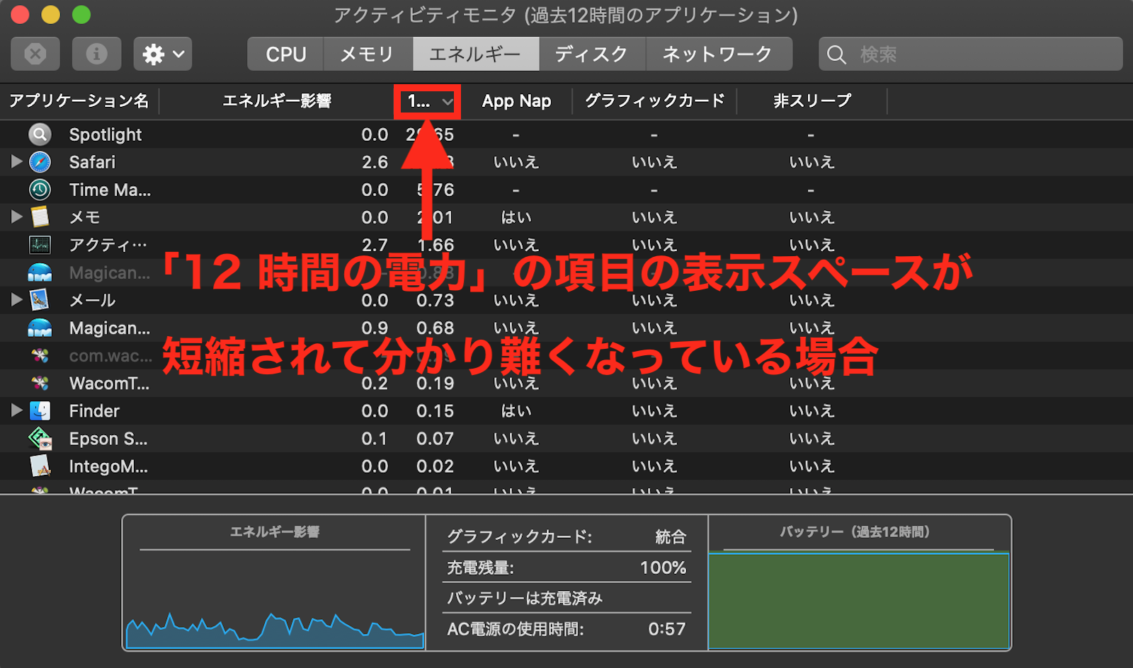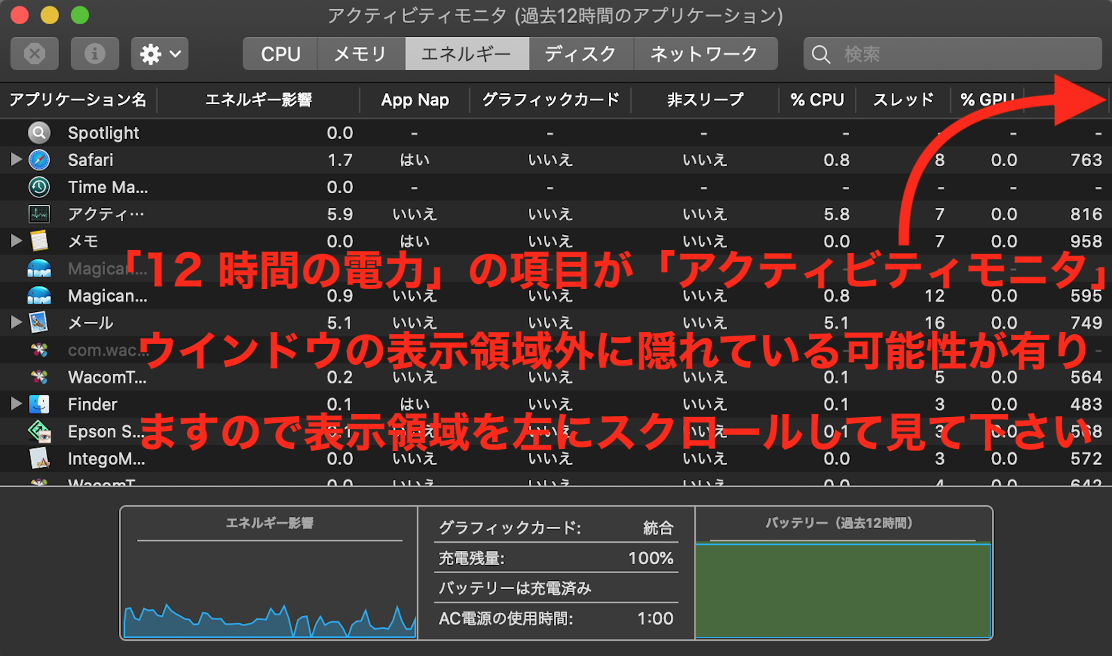 Grootr さんがお使いの Mac が、Mac ノートブックである場合ですが、「12 時間の電力」等の項目はドラッグして移動可能で、必ずしも「エネルギー影響」と「App Nap」の間に有るとは限りません ので、下の画像の様に「12 時間の電力」の項目が、「アクティビティモニタ」ウインドウの表示領域外に隠れている可能性が有る為、表示領域を左にスクロール して見て下さい。