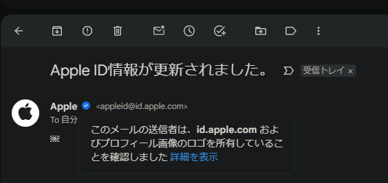 お客様がこの変更を行っていない場合、または他人が不正にお客様のアカウントにアクセスしていると思われる場合は、すみやかにApple IDアカウントのページ(https://appleid.apple.com)でパスワードを変更してください。
