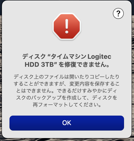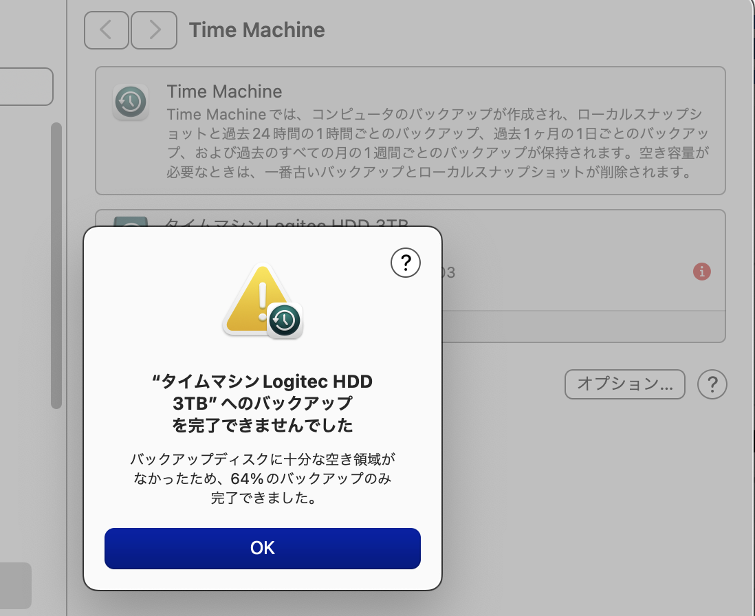 「"タイムマシン Logitec HDD 3TB" へのバックアップを完了できませんでした」と表示された