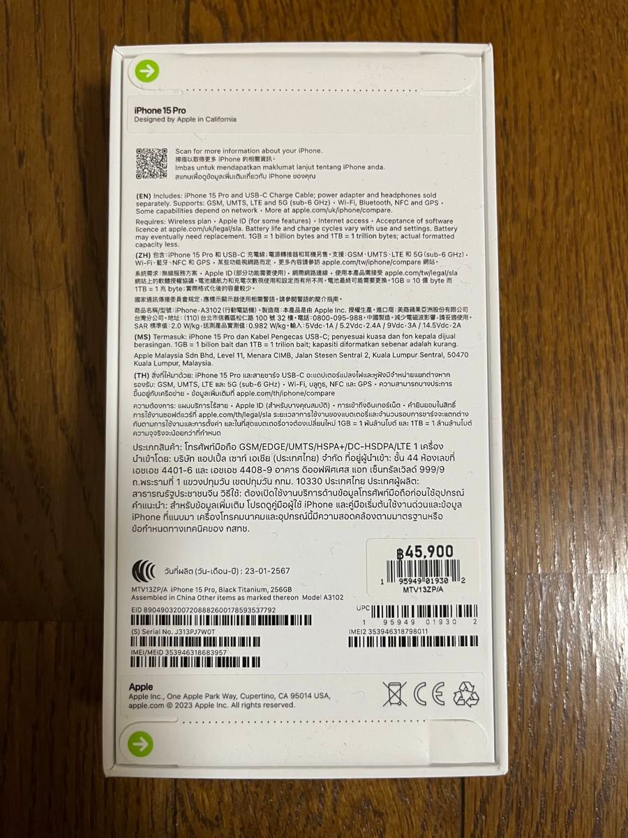 当該の iPhone 15 Pro は、どちらで購入 されましたでしょうか? また、当該の iPhone の外箱の裏面にも、同様に表記 されていますでしょうか?