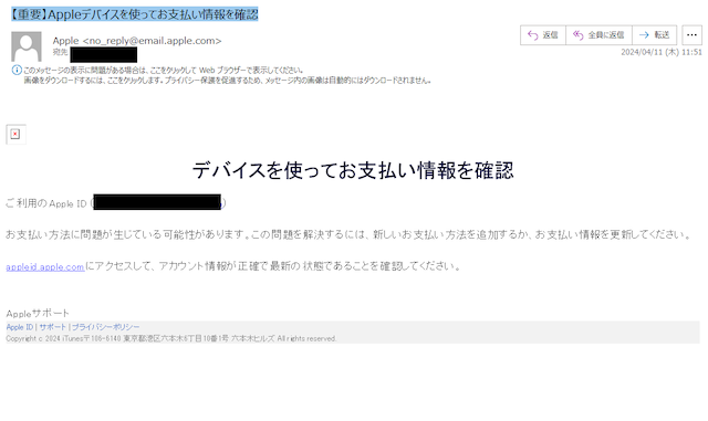 また、AppleIDはこのメールが送られてきているメールアドレスでは登録していないので、このようなメールが送られてくることも疑問に思っております。