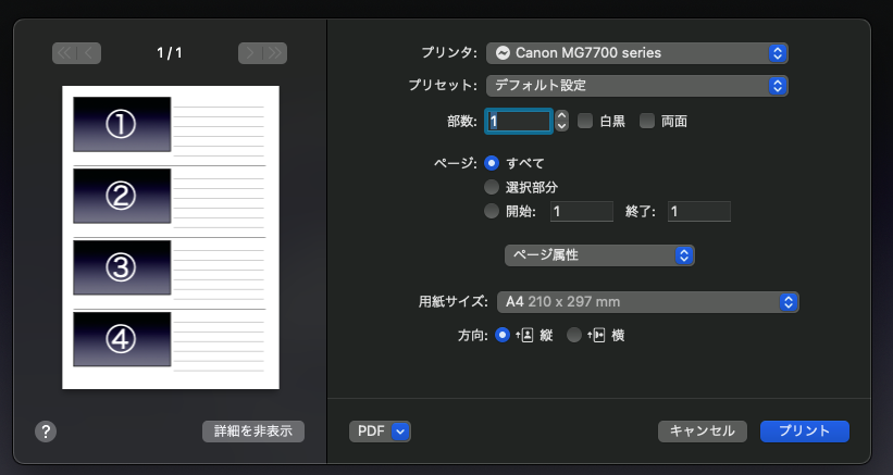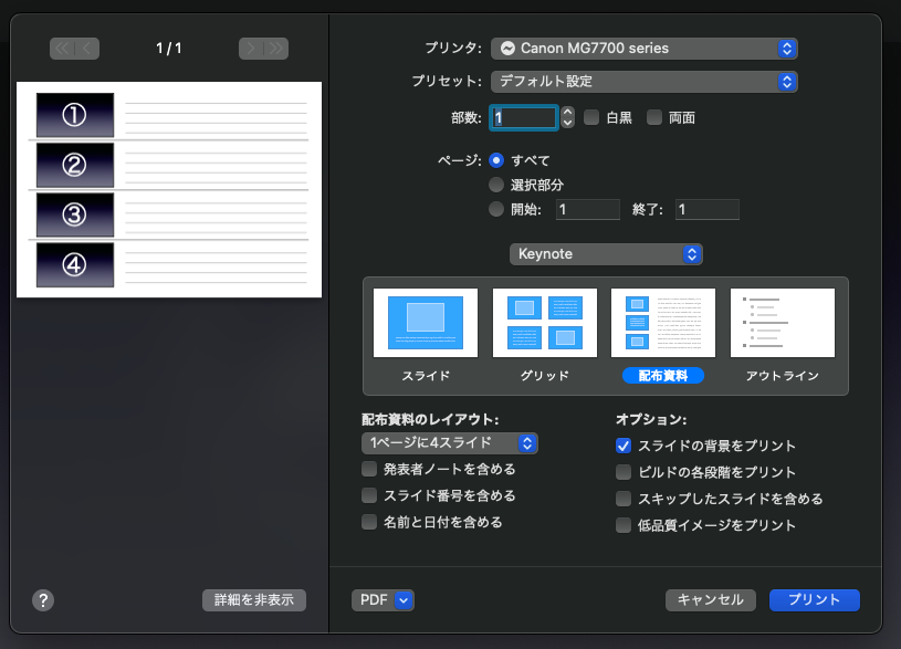 Macだと、Keynoteのメニューバー「ファイル」>「プリント…」でプリントダイアログを開いて、下図のように詳細表示の状態で、