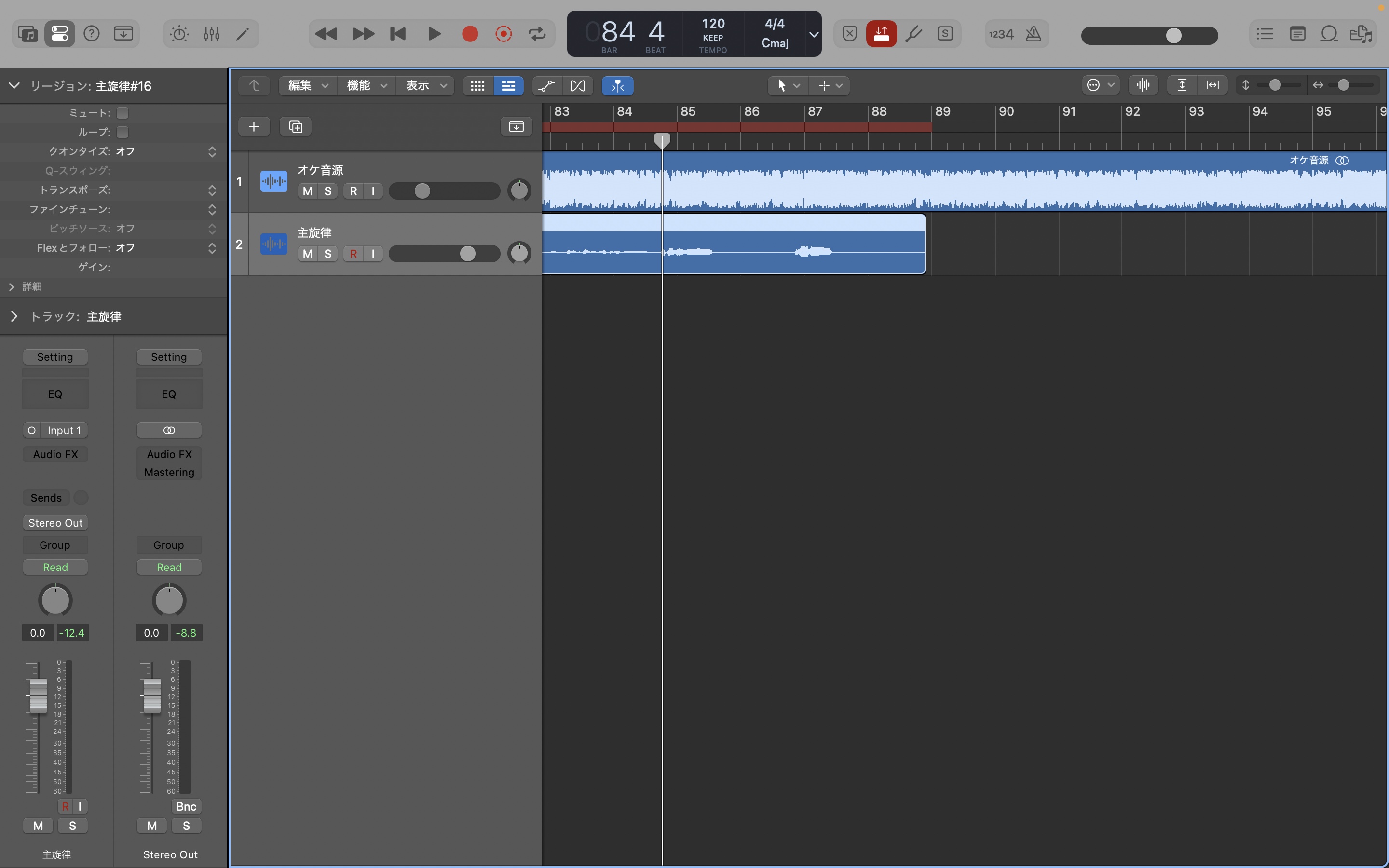 写真のトラック2の部分で再生ベッドから波形が間隔を空けて2つあると思うんですが、この波形がない部分も録音している時は歌っていて、この場合だとロングトーンに当たる部分なんです。(言い忘れましたがボーカルのトラックになります。)