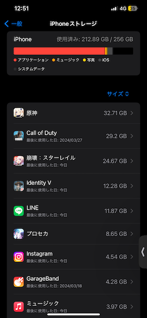 アプリごとに表示されてる容量とタップしてみるアプリサイズと書類とデータと合わない