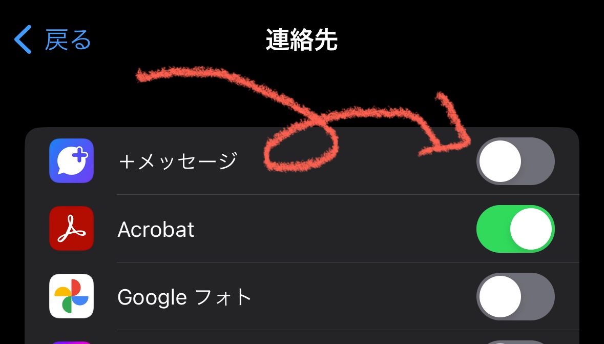 子どもに使わせているiPhoneSE第2世代に+メッセージ(プラスメッセージ)というアプリをインストールしたのですが、「連絡先へのアクセス権限」を要求されるのですが、設定画面に遷移すると項目がありません。
