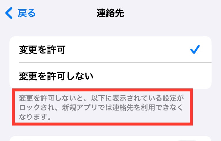 スクリーンタイム設定中のiPhoneで、「プラスメッセージ」の連絡先へのアクセス権限が設定できない