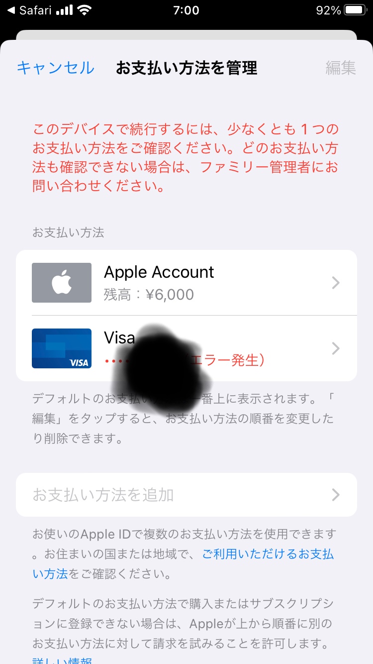 しかし、万尋さんの場合、「お支払い方法を追加」がグレーアウトしている状態なのでその画面に到達できないのではないでしょうか。