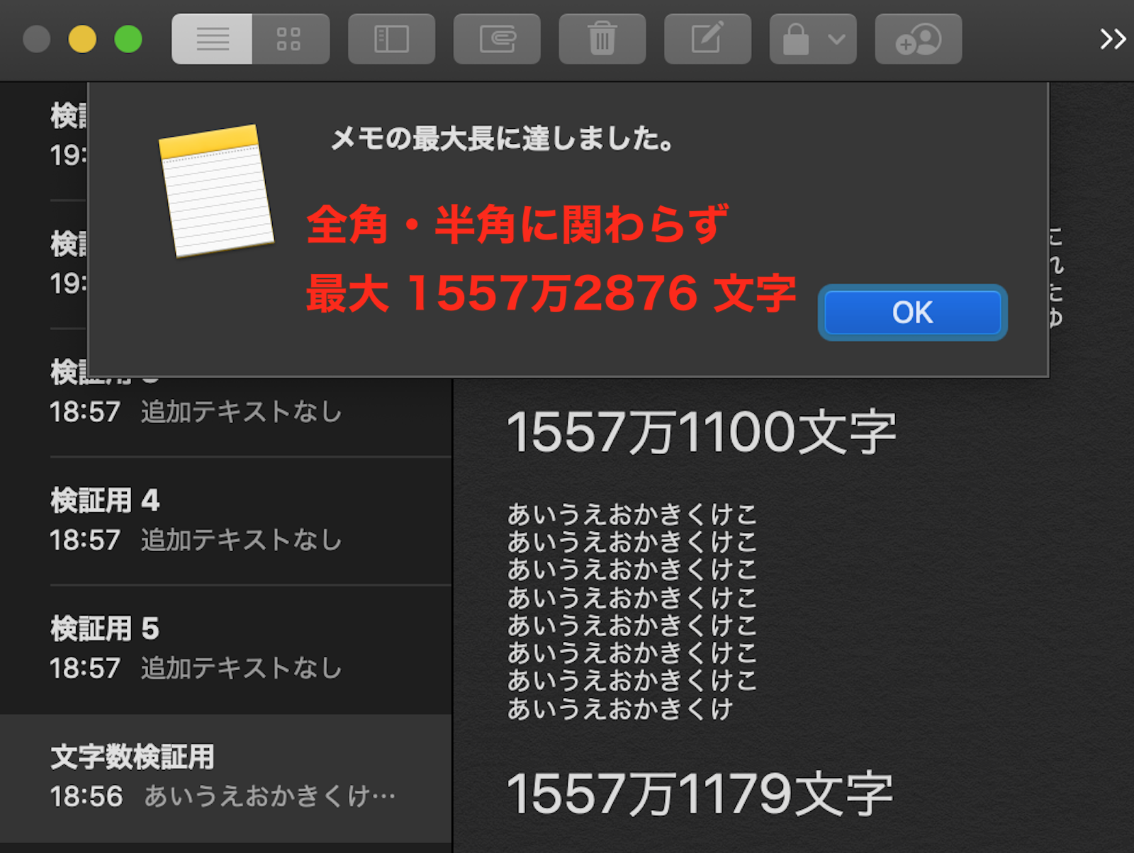 文字数につきましては、デバイスの内蔵ストレージ及び iCloud ストレージの空き容量以外にも、全角・半角共に最大 1557 万 2876 文字の制限 が有る様です。