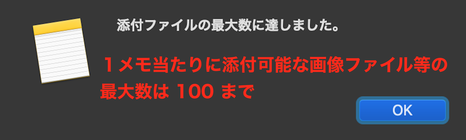 また、1 メモ当たりに添付可能な画像ファイル等の最大数は、100 まで と言う制限が有ります