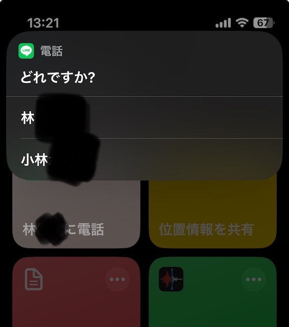 ショートカットを使って特定の相手へLINE通話を行えるようにしたいのですが、設定後に実行すると、設定者と字が被る別相手がなぜか選択表示されます。