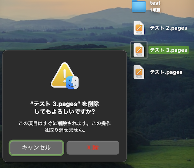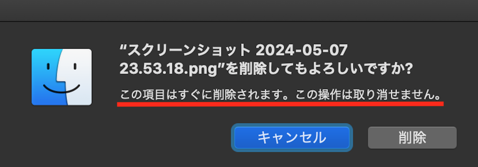 ゴミ箱にファイルを移動すると”この項目はすぐに削除されます。この操作は取り消せません。”
