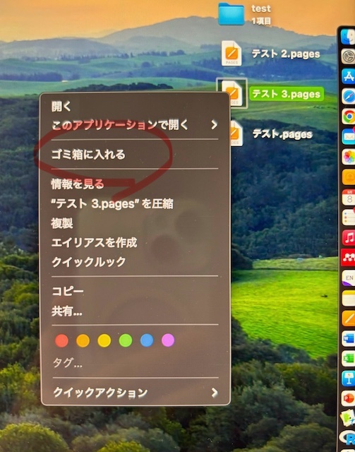 時間がたったもの(テスト2)、また一度フォルダ内に移動したものは一旦ゴミ箱に溜まったのちに空にすると押すと消えました。同時にデスクトップ上のファイルをフォルダに移動すると、デスクトップ