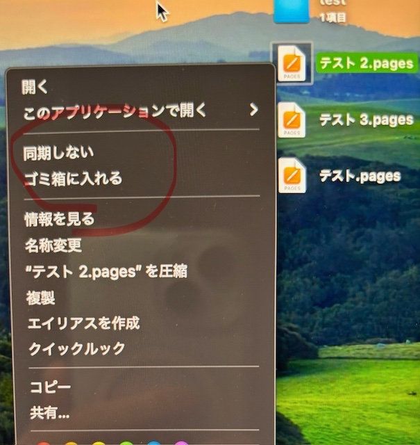 2つの違いは右クリックを押して際にゴミ箱に一旦入る方は”同期しない”という項目がありますが、ゴミ箱に入らず、すぐに削除されるファイルは”同期しない”が表示されません。