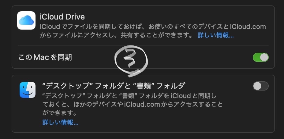 ですので、drop boxへのデスクトップのバックアップをやめて、drop boxの中にあったデスクトップを本来の位置に戻すことで改善いたしました。おそらくそれが原因で、デスクトップフォルダと書類をicloudを用いた同期もできていませんでした(写真3)。