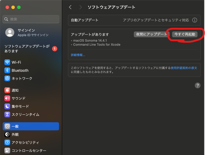半年前、 Ventura(13.X.X)からSonomaにアップデートした際も同様の事象が発生し、その時は初期化してキッティングしなおしました。それで解消されたかと思っていましたが、今回Sonoma 14.3.1から14.4.1へアップデートしようとしたところ、再発してしまいました。