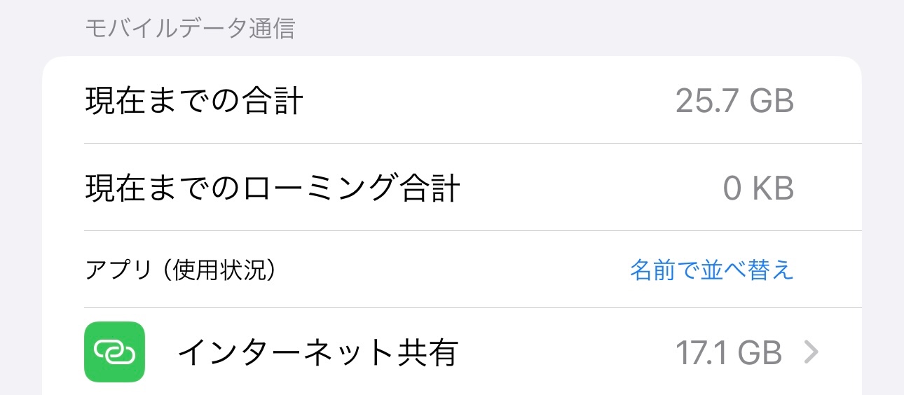 ahamoアプリで確認した際には4.2gbしか使用していない表記になっているのにも関わらず、iPhoneの設定ではインターネット共有の使用量が「その他のデバイス 10.8gb」となっています。