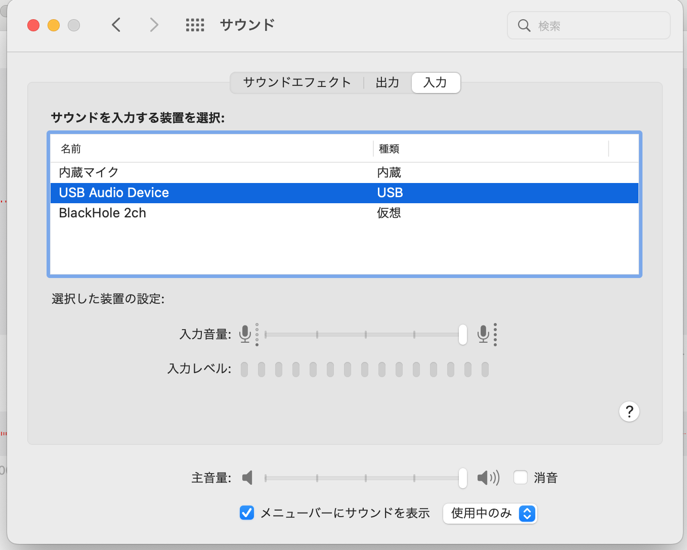 Macbookのボイスメモに外部マイクロフォン(USB)から音声入力したい