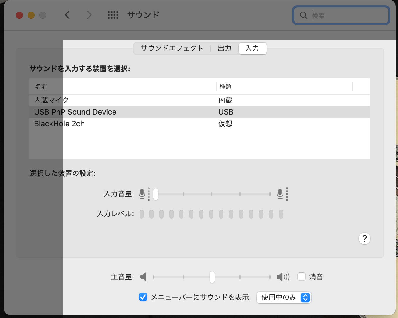 Macbookのボイスメモに外部マイクロフォン(USB)から音声入力すべく USBマイクロフォンを接続したが 蚊の鳴く声ほども入力できない(レベル0で反応なし)
