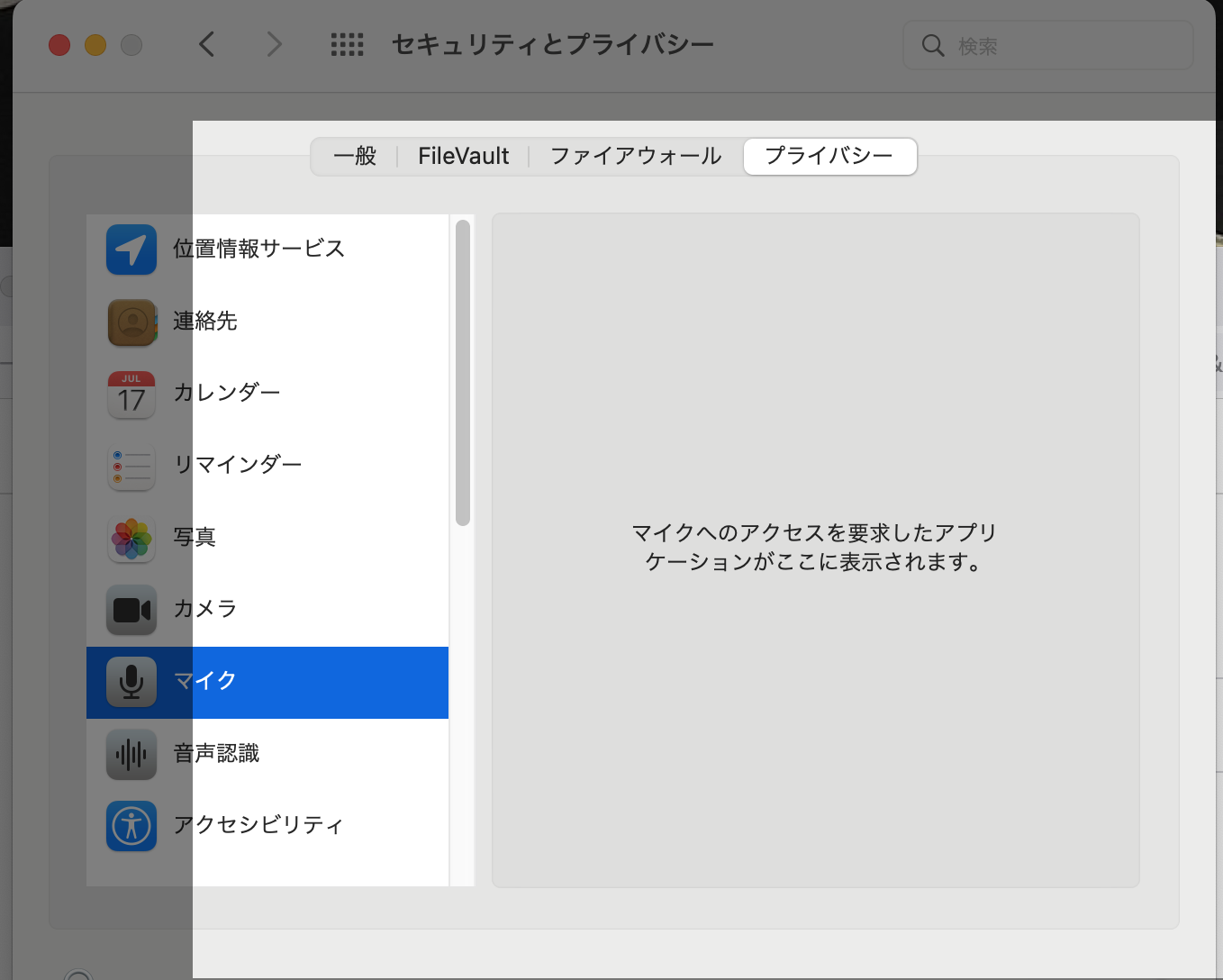 「システム環境設定」の「サウンド」で見ると<i>のように USBマイクロフォンが認識されているが <ii> 「セキュリティとプライバシー」では「マイク」の項が「マイクへのアクセスを要求したアプリケーションがここに表示されます」と表示されるものの 「ボイスメモ」は「マイクへのアクセスを要求したアプリケーション」のはずなのにここに表示されていない