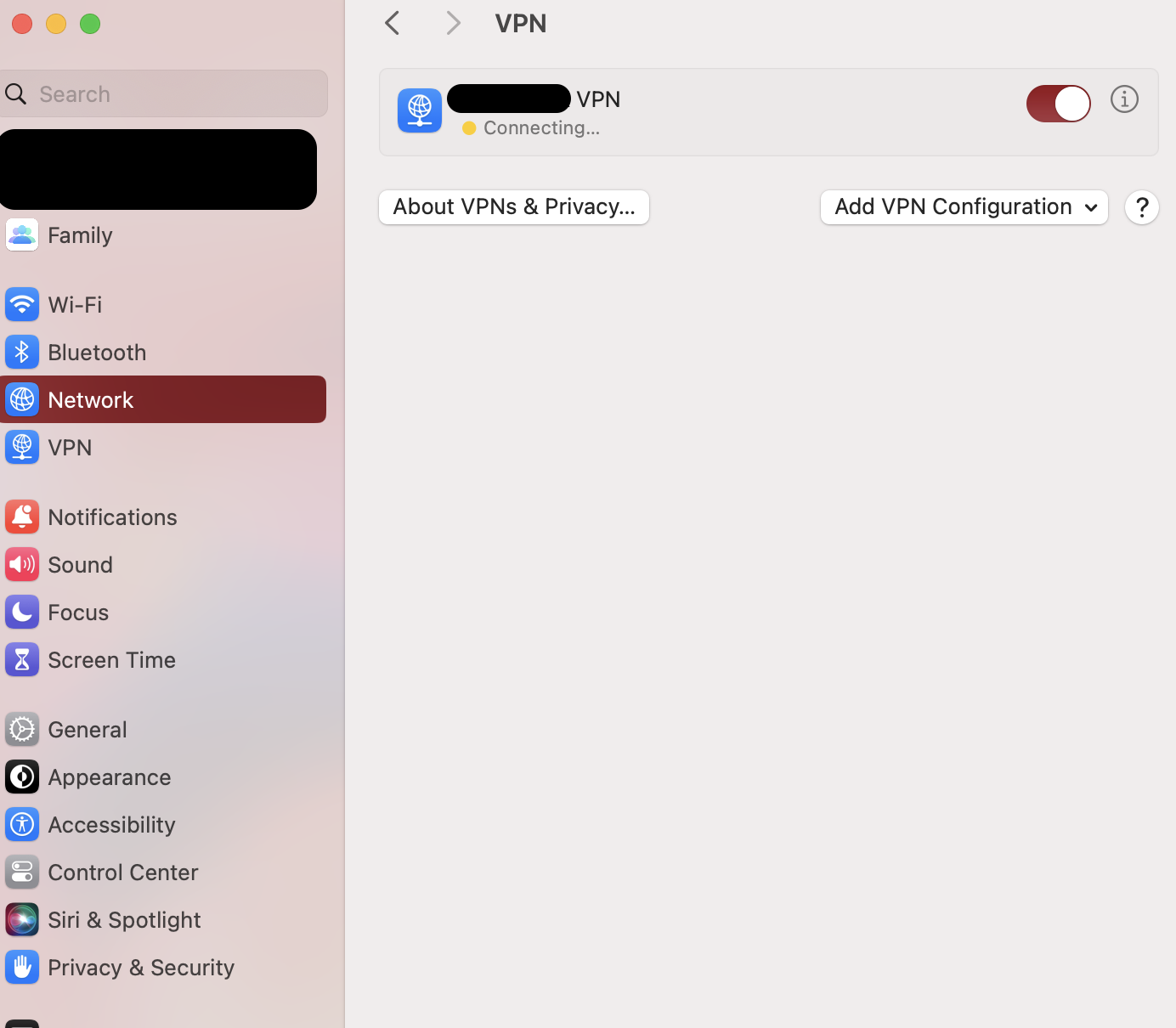Macのシステム設定を開けて、VPNをクリック、VPN接続のために必要な情報(サーバーアドレス、リモートID,ユーザー名、パスワード)を入力、VPNを接続するためのボタンをクリック(左から右へ移動させるボタン)、connectingと出るのですが、connectedになりません。時間が経つと、接続解除になります。(スクショ添付)