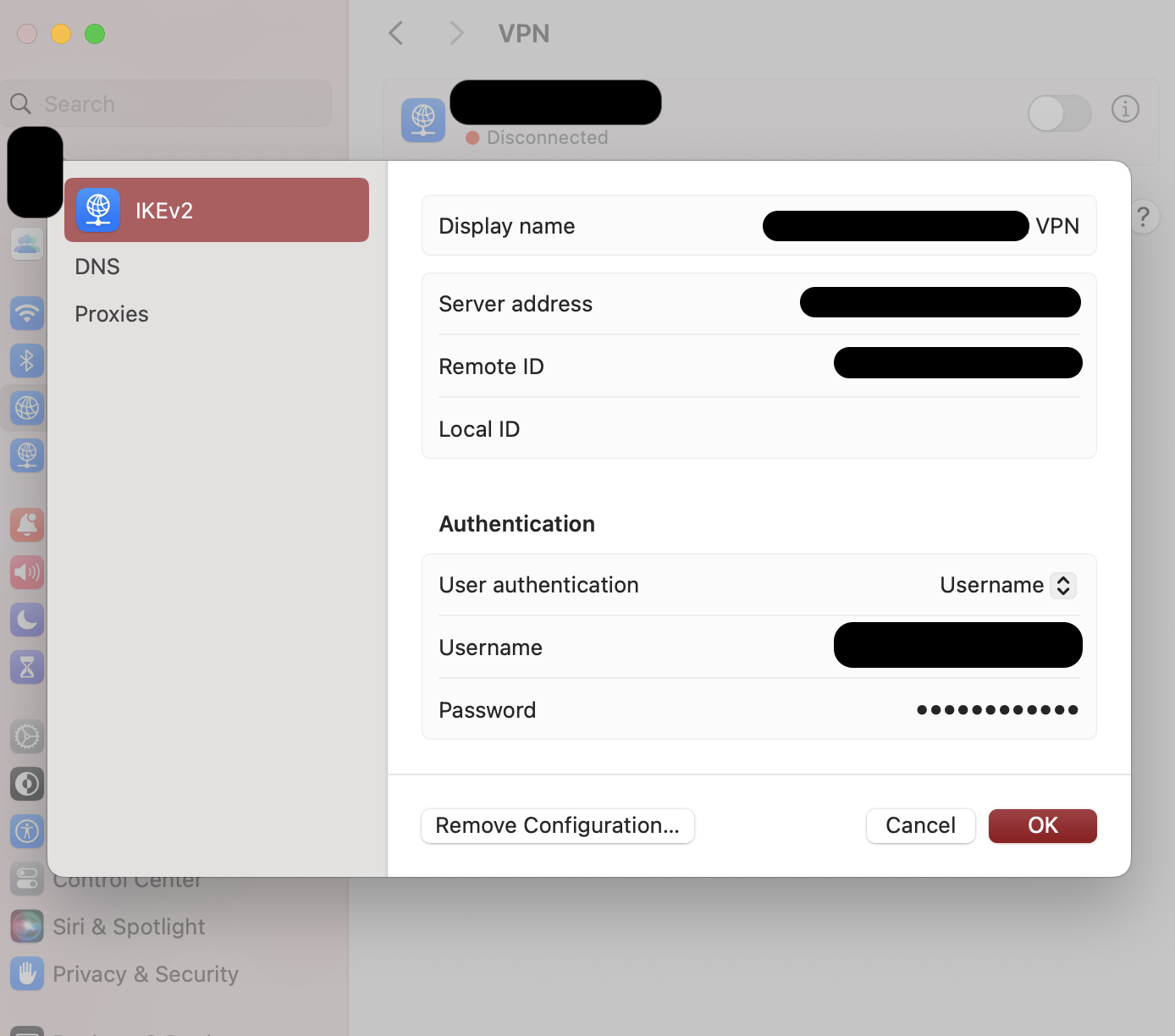 IKEv2のVPN接続を設定したんですが、vpnの接続ができません。Windowsを使用している人は同じサーバー名、ユーザー名やパスワードで接続できたそうなので、Mac OS Sonomaでのvpn接続の対処方法があるかと思います。対処方法を教えてください。