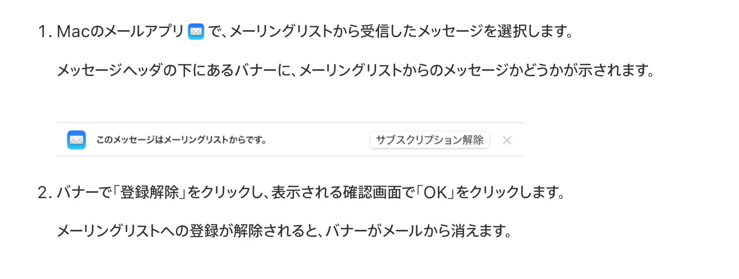 Macのメールの受信で、『このメッセージはメーリングリストからです。』というサブスクリプション解除ボタン自体が、表示されなくなってしまった。おそらく✖️でこのメッセージを閉じてしまったため。それ以降のメールにも表示されなくて困っています。