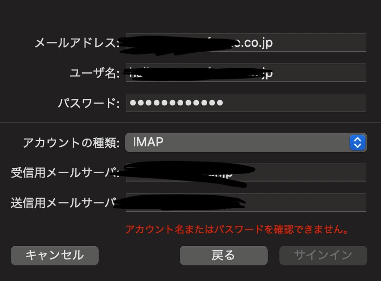 Macに .co.jpのメールアドレスを追加したいのですが、追加できません。解決方法があれば教えて頂きたいです。