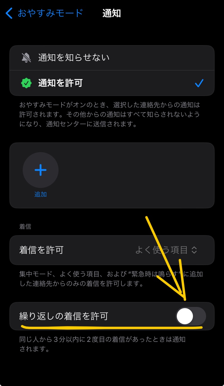 であれば、「繰り返しの着信を許可」というオプションは見つかりません。