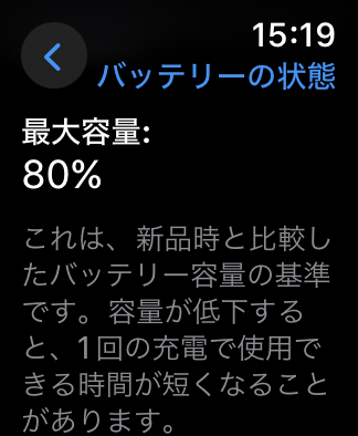 (Apple では、バッテリーの蓄電容量が本来の 80 % 以上であれば正常な状態と言う認識ですので)
