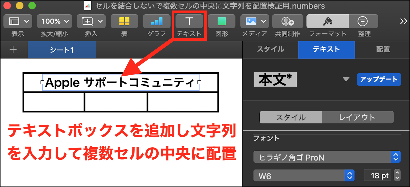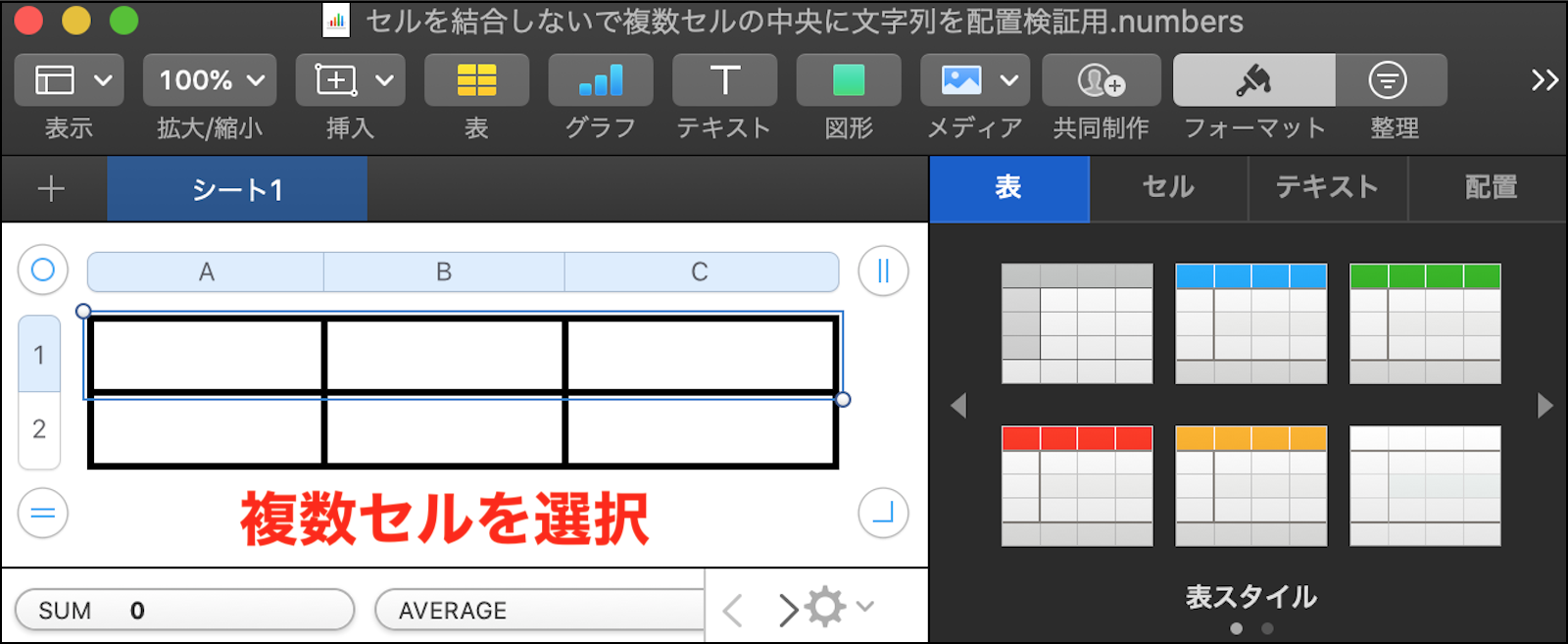 見た目だけですが、「Numbers」でセルを結合しないで複数セルの中央に文字列を配置する場合には、以下の様な工夫が必要になるかと思います。
