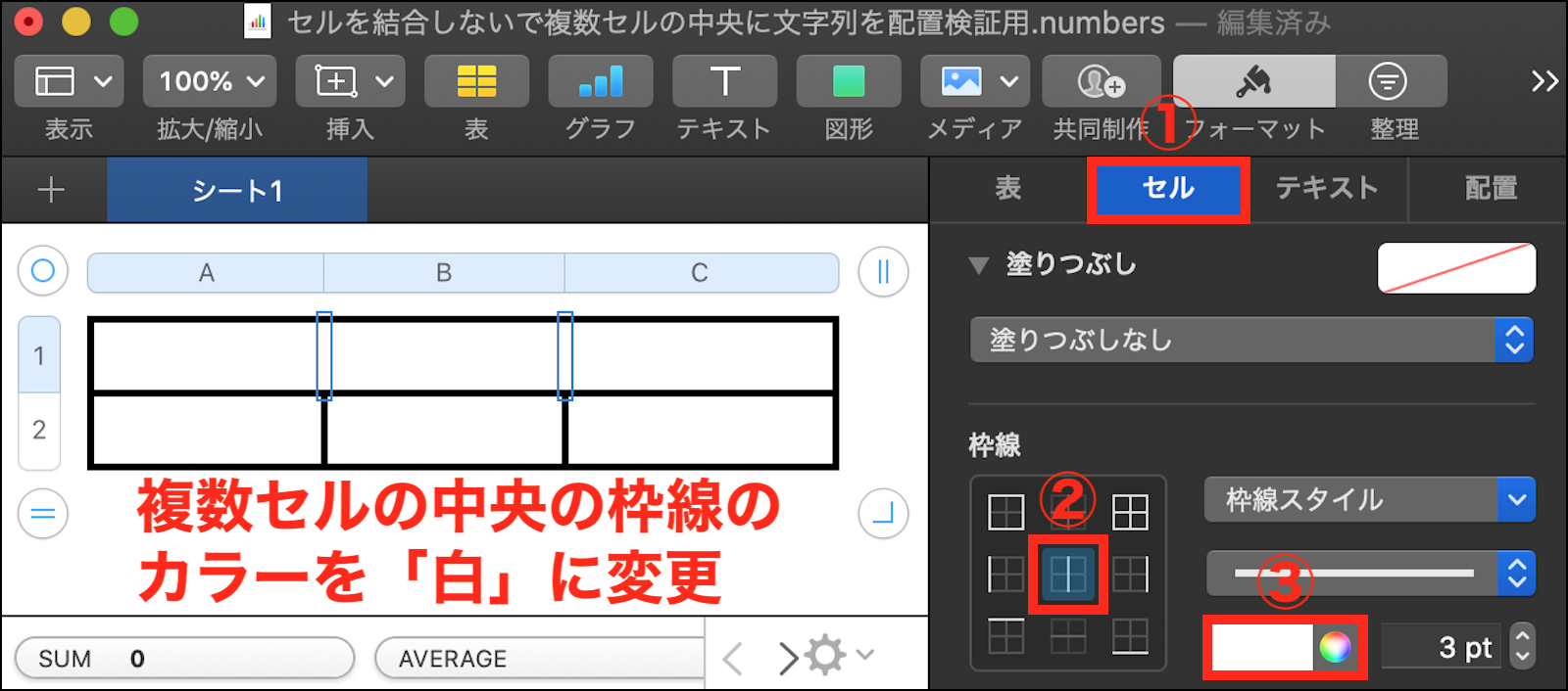 2.下の画像の様に、「フォーマット」インスペクタ >「セル」タブ >「枠線」セクションで、「中央の枠線」を選択して「カラー」を「白」に変更。