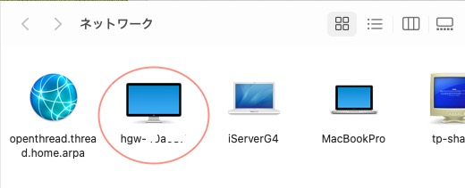 自宅のWi-Fi環境下でMacBook AirのFinder→場所→ネットワークと進むとhgw-?????(?は数字とアルファベットの組み合わせ)と表示されています。