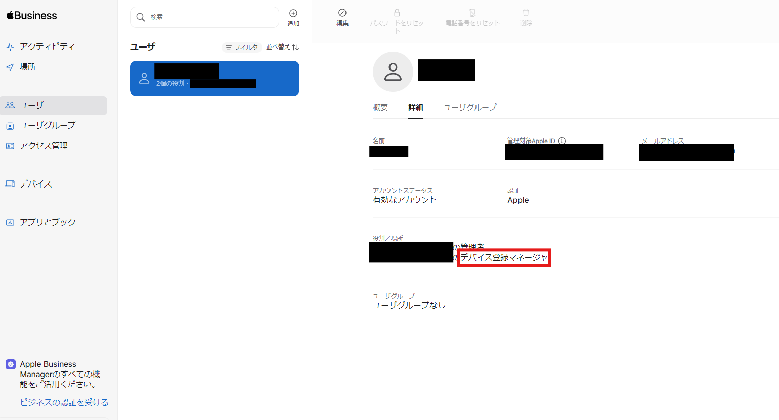 MDM設定のため、Apple Configuratorを利用したいため、Apple IDでサインインを試みているのですが、「このユーザは承認されませんでした」というエラーが出ました。エラー詳細を確認すると、「デバイス登録マネージャの役割が付与されている管理対象Apple IDでサインインしてください」とのことです。