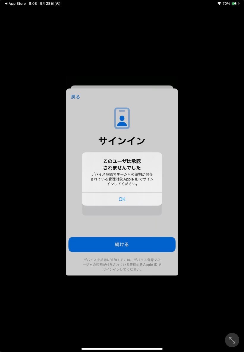 Apple Configurator へのサインイン - デバイス登録マネージャとなっていますが、エラーが出た