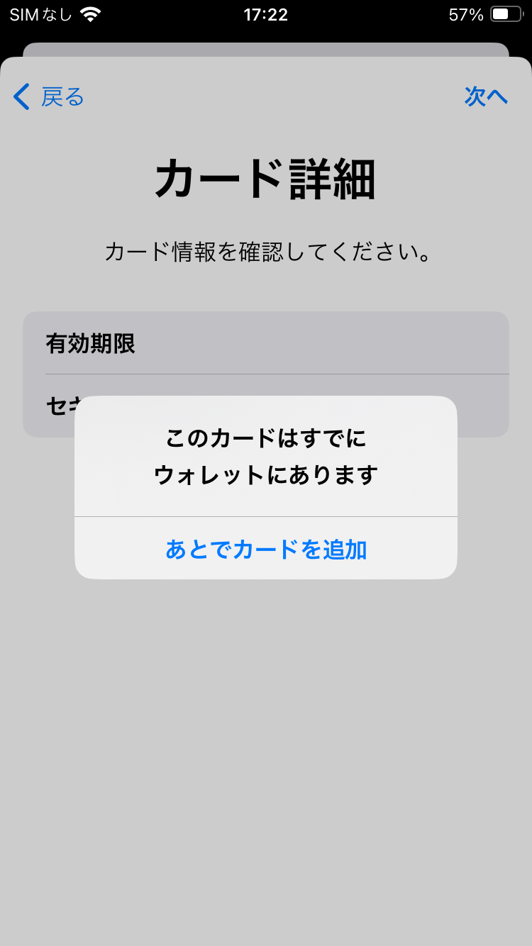このカードはすでにウォレットにありますと表示されて、先へ進めません。