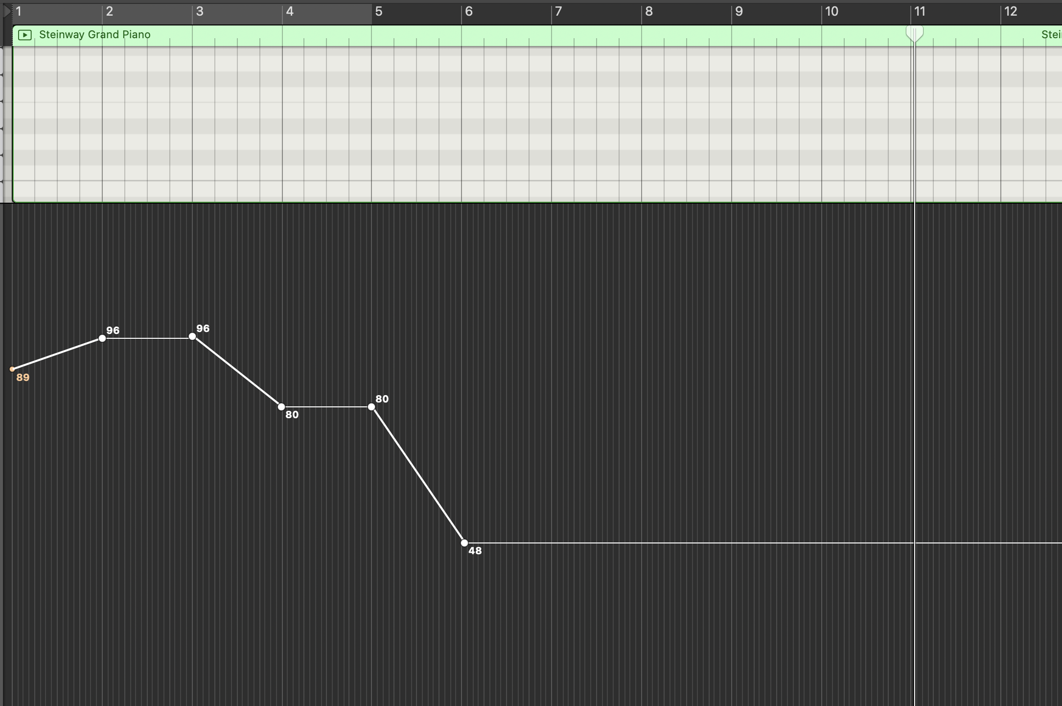 当方の認識では,コントロールデータは「点」で入力(例:96,80,72等)しても,その間のデータも自動的に補完され,連続的に変化させることができるはずです(トラック1はそのような状態)。それが,コピー&オリジナルの位置にペーストすると,その補完されたデータがなぜかコピー(or ペースト)されず,変化点のデータしかペーストされない,という現象が起きていると思われます。