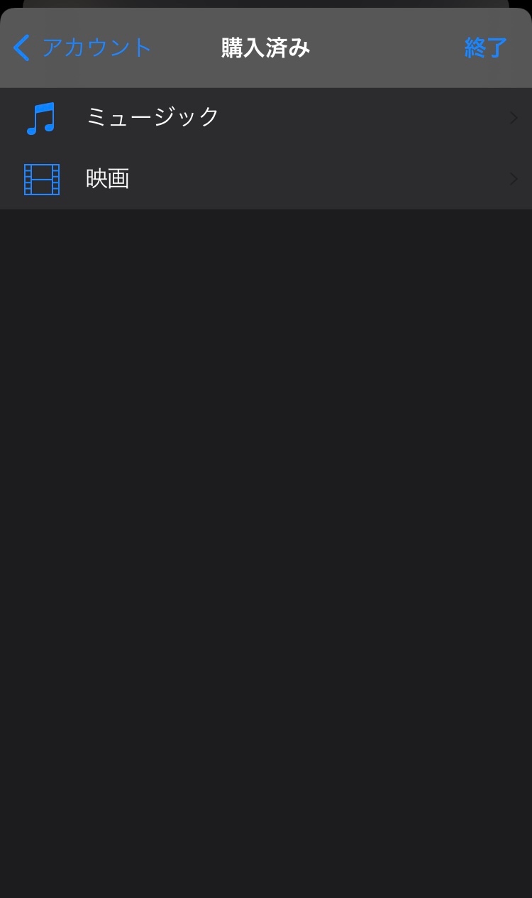 本来なら「ミュージック」「映画」と項目が出てるはずですが、それもなくただ「ダウンロード可能な購入済アイテムはありません」と出てきてしまいます。