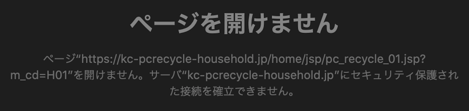 また、少し前までは、下記リンクのページの 宅配でのリサイクル のリンクから、無償で宅配でのリサイクルを申し込む事が出来た のですが、現在、宅配でのリサイクルを申し込もうとすると、何故か下の画像の様にページを開けない状態で、宅配でのリサイクルを申し込む事が出来ません。